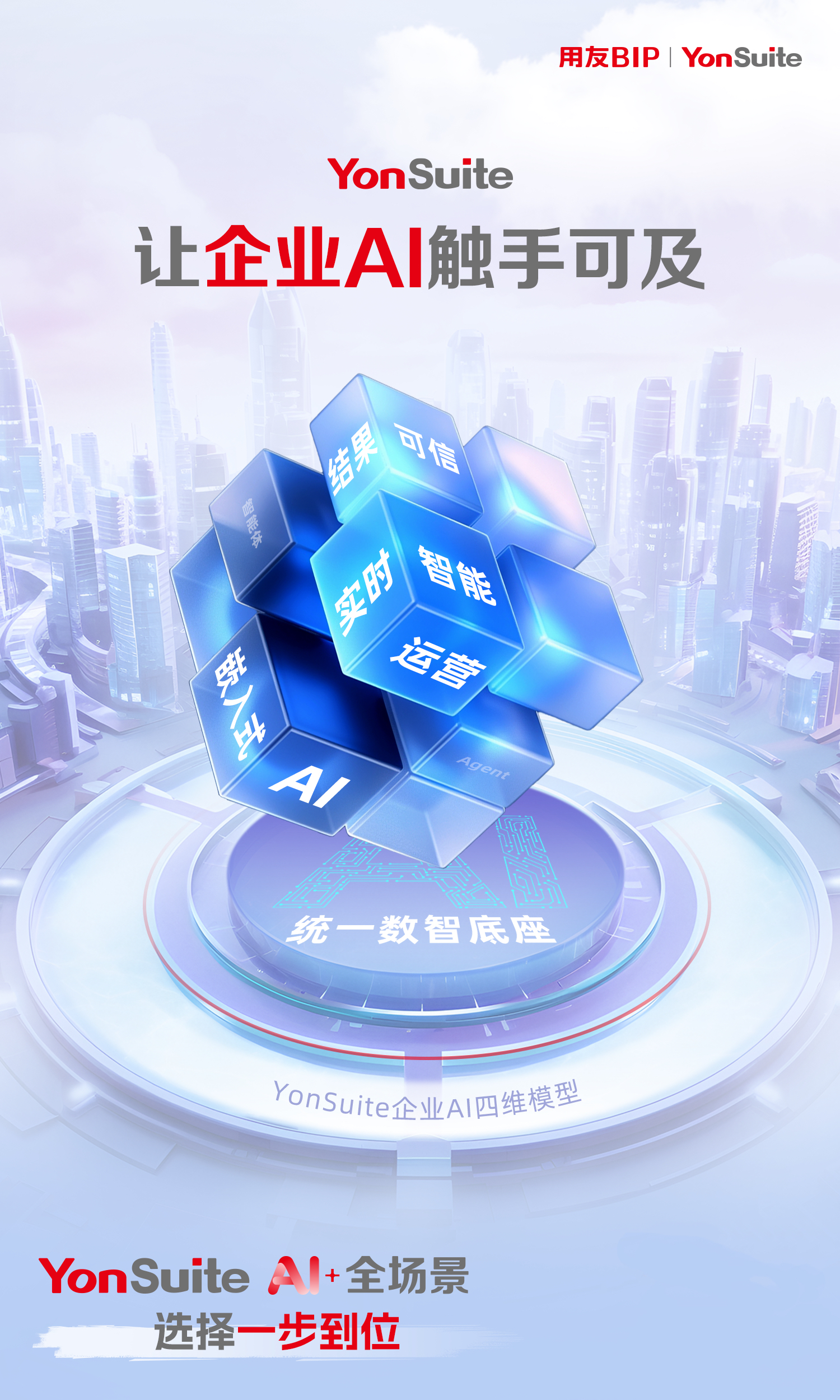新品牌slogan中的兩個“One”,承載著深遠(yuǎn)的戰(zhàn)略寓意,共同勾勒出AI時代全球商業(yè)的恢弘圖景與YonSuite的全新定位:
