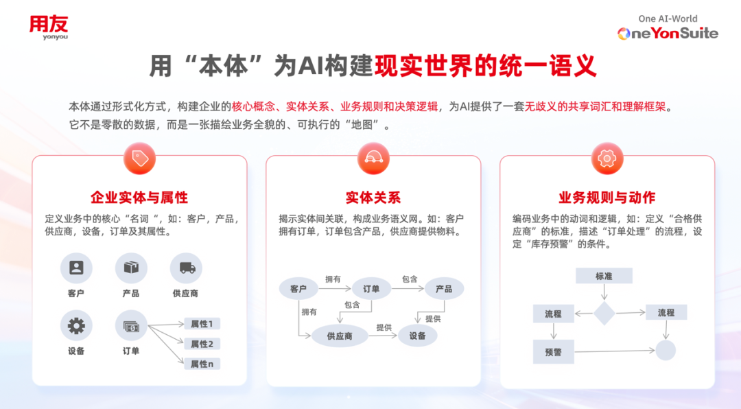 也正是在這樣的背景下,企業(yè)對AI的熱情與焦慮并存。許多管理者希望通過AI實(shí)現(xiàn)降本增效,但企業(yè)級AI的落地,絕非簡單接入一個大模型,更非追逐一時熱點(diǎn)。它是一項(xiàng)必須依托于工程化體系、業(yè)務(wù)規(guī)則和平臺能力的系統(tǒng)工程?;谟糜裏onSuite的長期實(shí)踐,我們得出一個核心判斷:要讓AI真正跨越企業(yè)應(yīng)用的“最后一公里”,關(guān)鍵不在于讓它更“能說會道”,而在于讓它真正懂業(yè)務(wù)、守規(guī)則、能協(xié)同。而實(shí)現(xiàn)這一目標(biāo)的核心抓手,正是本體驅(qū)動的智能體(Ontology-driven Agent)。